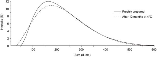 The formulations were diluted with Milli-Q water (1:10), and a drop of the dispersion was spread onto a 400-mesh collodion-coated Cu grid (Merck KGaA, Darmstadt, Germany). Phospho-tungstic acid was added to enhance contrast. Images were observed in a Jeol-1200 EX II-TEM microscope (Jeol, MA, USA).