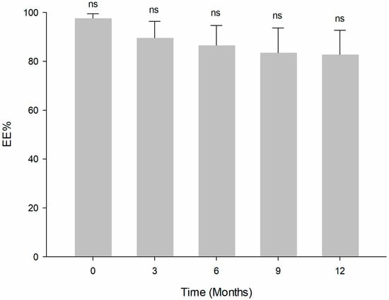 Based on the results of the comprehensive analyses of the different NLC formulations, F4 was selected as the top candidate for further evaluations (from now on called NLCs-DXM). This NLC-DXM formulation was stable for at least 1 year when stored at 4 °C. No significant changes in size distribution and PDI were observed (Figure 3, upper panel). The Z pot values of freshly prepared NLCs and 1 year-stored NLCs were −9.3 ± 1.4 mV and −12.0 ± 0.4 mV, respectively, suggesting no significant changes (p ≥ 0.05). Furthermore, no significant differences were noted regarding the NLC drug content (EE) measured every 3 months for a total of 1 year (Figure 3, lower panel).