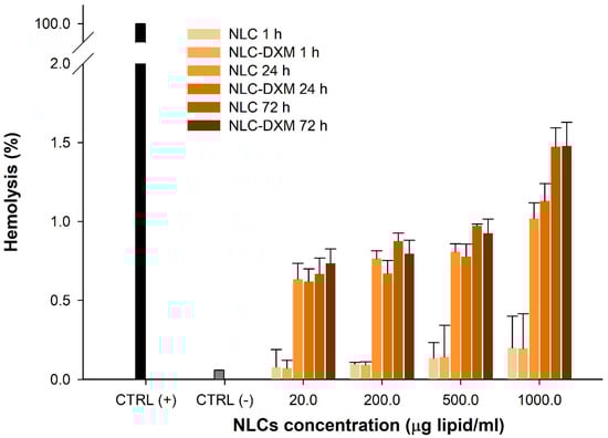 Next, the hemocompatibility of NLC formulations was assayed (Figure 4). Different concentrations in the range from 20.0 to 1000.0 µg MM lipid/mL were tested. Negligible hemotoxic effects (<0.4%) were observed when applying both NLCs and NLCs-DXM formulations (1 h) to erythrocytes at the highest NLC concentration tested (1.0 mg/mL). After 24 h incubation, a low degree of hemolysis was observed with values below 1.1%. After 72 h incubation at the highest NLC concentration, about 1.5% of erythrocytes were lysed by either NLC formulation.