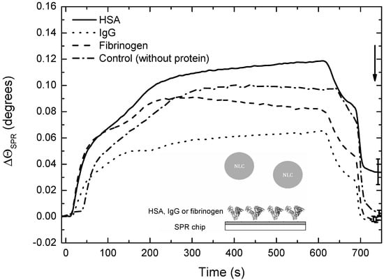 In order to investigate the biomolecular interactions that may occur between NLCs- DXM and plasma proteins, surface plasmon resonance (SPR) measurements were performed. In the present work, immunoglobin (IgG) and fibrinogen were tested as examples of opsonins (shown to diminish circulation time) [] and human serum albumin (HSA) as a disopsonin (reported to enhance circulation time) [].