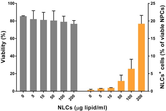 The biological activity of NLC formulations was tested using primary murine NPCs as potential target cells for DXM delivery. NPCs were incubated for 24 h with NLCs at different concentrations ranging from 0 to 200 µg of solid MM lipid/mL of culture media. Viability assessment showed no apparent cytotoxic effects of NLCs on NPCs after incubation (Figure 6). Furthermore, NLC uptake was evaluated using NLCs labeled with DiD dye. Flow cytometry results demonstrated a dose-dependent uptake of NLCs by NPCs, up to 20% in case of the highest dose applied.