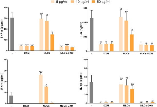 NLC-derived DXM prevents LPS-induced NPC activation. TNF-α, IL-6, IFN-γ and IL-1β levels of DXM-treated of NPCs cultures were monitored. NPCs were incubated with NLC formulations (5, 10 and 50 µg/mL), followed by LPS (100 ng/mL) application. On the next day, supernatants were subjected to cytokine analysis. Data denote the means ± SEM obtained in 3 independent experiments. Significantly different from control (LPS only): no significant difference (ns); * p < 0.05; ** p < 0.01; **** p < 0.0001 (Two-way ANOVA, Dunnett’s multiple comparisons test).