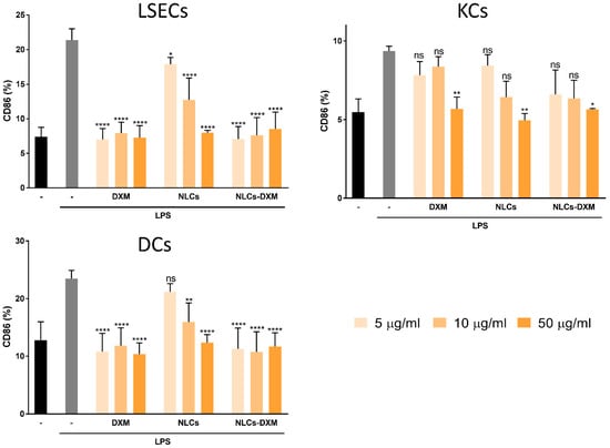 The cellular activation state was further evaluated for each of the NPC subpopulations. As expected, LPS treatment induced an up-regulation of the co-stimulatory marker CD86 by either NPC population. However, when NPCs were pre-treated with soluble DXM the frequency of CD86+ cells reduced. This decrease in cellular activation confirmed the anti-inflammatory effects of DXM for each of the NPC populations studied. Moreover, very similar effects were observed in the case of treatment with NLCs-DXM (Figure 8). Empty NLCs also prevented the LPS-induced upregulation of CD86 by either liver NPC population, but only in the case of the highest dose. However, in KCs only the highest concentration of DXM in soluble or particulate form significantly attenuated LPS-induced CD86 upregulation. In contrast, LSECs and DCs displayed total inhibition of LPS-induced CD86 upregulation when treated with DXM in soluble or particulate form, in either case even at the lowest dose (5 µg/mL) applied.