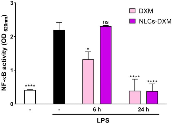 NLCs-DXM inhibit LPS stimulation due to delayed release of the drug. RAW-Blue™ cells, derived from RAW 264.7 macrophages and containing SEAP reporter construct inducible by NF-κβ, were pre-treated with DXM or NLCs-DXM (each 1000 µg/mL). Next, LPS was added to the culture media to induce NF-κβ activation. DXM-mediated inhibition of this response by both treatment options was measured by NF-κβ-dependent, SEAP activation. Data represent the means ± SEM obtained in 3 independent experiments. Significant differences versus LPS+ untreated cells are indicated: no significant difference (ns); * p < 0.05; **** p < 0.0001 (Two-way ANOVA, Dunnett’s multiple comparisons test).