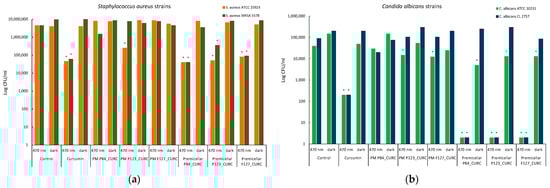 The evaluation of the antimicrobial activity against reference and clinical isolate strains of E. coli, S. aureus, and C. albicans demonstrates that CURC loaded into Pluronic micelles shows a slightly lower efficiency compared to free CURC dissolved in DMSO, in both dark and irradiation conditions. The efficiency of the CURC-loaded polymeric micelles as a photosensitizer was tested at sub-MIC concentrations using irradiation at 470 nm, considered a very safe light exposure for normal cells. In these moderate conditions, no reduction in the bacterial growth was recorded for both E. coli cultures. Our results show that the Gram-positive bacteria and fungi were more susceptible to the PDT treatment, with moderate results for the reduction in the bacterial growth of S. aureus for CURC in all block copolymer derivatives, and very good results in the case of C. albicans treated with submicelar solution of Pluronics.