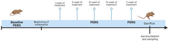 RGC function was evaluated by means of pattern electroretinogram (PERG) before the beginning of the treatment (baseline, week 0) and after 3 and 5 weeks of treatment (Figure 1). Moreover, at the end of the experiments, i.e., 5 weeks, the mice were sacrificed and their retinas collected for immunohistochemical staining and molecular biology analyses as described below.