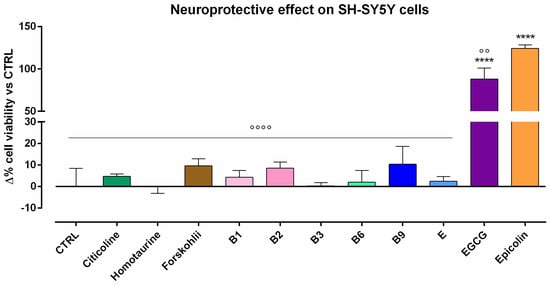 The neuroprotective effect of single ingredients and their associations, i.e., Epicolin formulation, were investigated on the SH-SY5Y cell line. To this end, in vitro neurotoxicity was induced by STS and the neuroprotective effect, in terms of cell viability, was evaluated by MTT assay. The results demonstrated that, among single components, only EGCG was endowed with a statistically significant neuroprotective effect with respect to the CTRL (**** p ≤ 0.0001, Figure 2). Importantly, all single ingredients when mixed together, i.e., Epicolin formulation, showed a higher protective effect (**** p ≤ 0.0001 vs. CTRL), even compared to EGCG-treated cells (°° p ≤ 0.01) (Figure 2).