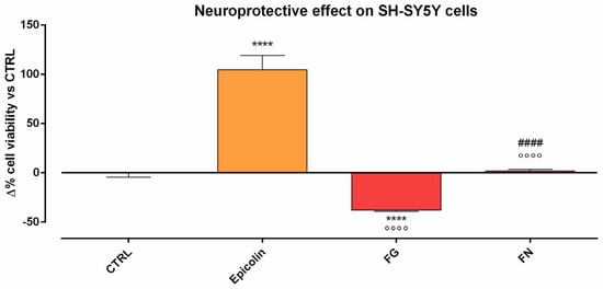 Neuroprotection on SH-SY5Y cells induced with staurosporine (STS, 250 nM) and treated with Epicolin, Formulation G (FG), or Formulation N (FN). The data are represented as percentage differences (Δ) compared to the control (CTRL). The data represent means ± SEMs of at least three different experimental days in triplicate. Statistical analysis was performed using one-way ANOVA plus Dunnett’s post hoc test. **** p ≤ 0.0001 vs. control (CTRL); °°°° p ≤ 0.0001 vs. Epicolin; #### p ≤ 0.0001 vs. FG.