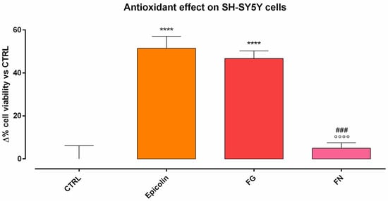 Antioxidant effect on SH-SY5Y cells induced with glucose oxidase enzyme (GOx, 5.3 mU/mL) and treated with Epicolin, Formulation G (FG), or Formulation N (FN). The data are represented as percentage differences (Δ) compared to the control (CTRL). The data represent the means ± SEMs of at least three different experimental days in triplicate. Statistical analysis was performed using one-way ANOVA plus Dunnett’s post hoc test. **** p ≤ 0.0001 vs. CTRL; °°°° p ≤ 0.0001 vs. Epicolin; ### p ≤ 0.001 vs. FG.