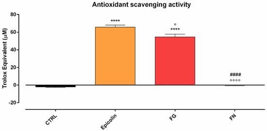 Scavenging antioxidant activity of Epicolin compared to Formulation G (FG) or Formulation N (FN). The data are represented as the trolox equivalent (µM). The data represent the means ± SEMs of at least three different experimental days in triplicate. Statistical analysis was performed using one-way ANOVA plus Sidak’s post hoc test. **** p ≤ 0.0001 vs. control (CTRL); ° p ≤ 0.05, °°°° p ≤ 0.0001 vs. Epicolin; #### p ≤ 0.0001 vs. FG.