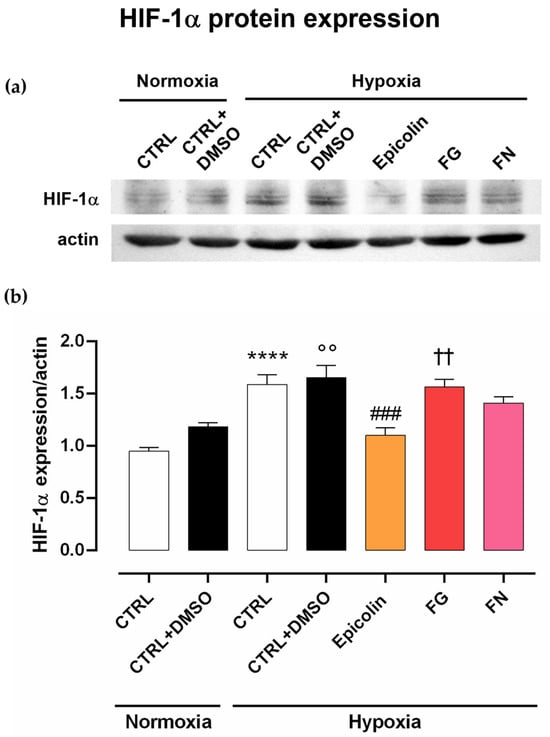As shown in Figure 6, four hours of hypoxia challenge led to a significant increase in HIF-1α expression in control samples (hypoxia, CTRL, and CTRL + DMSO) compared to normoxic control conditions (**** p ≤ 0.0001 vs. normoxia CTRL; °° p ≤ 0.01 vs. normoxia CTRL + DMSO), whereas Epicolin significantly reduced HIF-1α expression, compared to CTRL + DMSO, in hypoxic condition (### p ≤ 0.001, Figure 6). Moreover, Epicolin showed a protective effect against hypoxia insult through a stronger inhibition of HIF-1α expression, compared to FG (†† p ≤ 0.01) and FN, although the difference from the latter was not statistically significant (Figure 6). Finally, FN and FG treatments did not significantly reduce the hypoxia-induced increase in HIF-1α expression in MIO-M1 cells compared to CTRL + DMSO in hypoxic conditions.