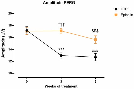 Evaluation of retinal ganglion cell (RGC) function with pattern electroretinogram (PERG) (amplitude values vs. time of treatment). PERG was recorded at baseline (week 0), and at the 3rd and 5th week of treatment. The data were plotted as means ± SEMs (n = 16 mice per group). *** p ≤ 0.001 vs. week 0; ††† p ≤ 0.001 vs. the control (CTRL) at 3 weeks; $$$ p ≤ 0.001 vs. CTRL at 5 weeks. Two-way ANOVA plus Tukey’s post hoc test.