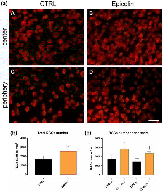 Immunostaining of RNA-binding protein and mRNA Processing Factor-positive (RBPMS+) cells for the analysis of retinal ganglion cell (RGC) density in flat-mount retinas. (a) RBPMS+ RGCs in central (A,B) and peripheral areas (C,D) of control (CTRL) and Epicolin formulation-treated mice. Quantification was carried out on the whole retina (b) and on both central and peripheral areas of the retina (c). Scale bar corresponds to 50 μm. The data were plotted as means ± SEMs (n = 12 retinas per group). * p ≤ 0.05 vs. CTRL; ° p ≤ 0.05 vs. CTRL c; † p ≤ 0.05 vs. CTRL p. Unpaired t-test. CTRL central (CTRL c), CTRL periphery (CTRL p), Epicolin central (Epicolin c), and Epicolin periphery (Epicolin p).