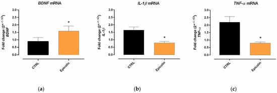 To assess the neuroprotective and anti-inflammatory effect of Epicolin formulation (208.6 mg/kg) in glaucomatous mice after 5 weeks of oral treatment (once a day), the mRNA expression of BDNF and inflammatory markers such as IL-1β and TNF-α was analyzed. The results showed that Epicolin formulation was able to significantly exert a neuroprotective effect, increasing the BDNF mRNA levels with respect to CTRL mice (* p ≤ 0.05, Figure 9a). Furthermore, the mRNA levels of IL-1β (Figure 9b) and TNF-α (Figure 9c) were significantly downregulated in Epicolin-treated mice compared to the CTRL mice (glaucomatous retinas), thus showing an anti-inflammatory effect.