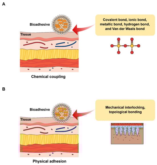 Mechanism of bioadhesives, (A) chemical coupling and (B) physical adhesion.
