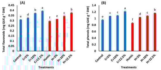 The interactive effects of salinity stress and priming with humic acid on the flavonoids and total phenols in the leaves of Giza 179 plants are shown in (Figure 3A,B). Compared to the control plants, increasing salinity levels caused a significant increase in flavonoids and total phenols with a maximum increase at 12.5% seawater. Seed priming with humic acid significantly decreased the contents of flavonoids and total phenols in leaves of Giza 179 plants under non-saline and saline conditions (Table 3). In salinity-non stressed plants, humic acid priming induced a decrease of 4.5% in flavonoids and 9.7% in total phenols. In salinity-stressed plants, the humic acid-induced decreases in flavonoids and total phenols were 4.5% and 3.2% at 5%, 7.5%, and 1% at 10% and 4.2%, and 4% at 12.5% seawater, respectively, in comparison with those in humic acid non-treated stressed plants.