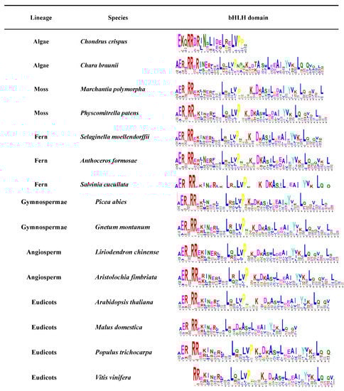 Plant bHLH diversity was already present in the early land plants before the moss and vascular plant lineages separated over 440 million years ago. Many current bHLH interactions also occurred in early land plants and were essentially conserved in the major plant groups [1]. The expansion of this family is closely related to plant evolution and diversity, not only in higher plants but also in lower plants such as algae, lichens, and mosses or non-plants such as mycobacteria [1]. The availability of a large number of land plants and algal genomes allowed further analysis of the conserved motifs of the bHLH gene family throughout the photosynthetic plant spectrum (Figure 2). Different numbers of members of the bHLH gene family have been identified in different species by searching for proteins containing the bHLH domain. The bHLH gene family was found to originate from Rhodophyta. The conservation of the bHLH conservative domain in different species was further predicted by MEME (Figure 2). According to the conservative motif, the bHLH domain will evolve to be more complete as species evolve. The evolution of the bHLH gene family also provides insights regarding the evolution of green algae into flowering plants through their adaptation to environmental changes [8]. Specifically, the genome-wide analysis of bHLH gene families from different species will help us to better understand the biological function, evolutionary origin, and expansion outcome of bHLH genes.