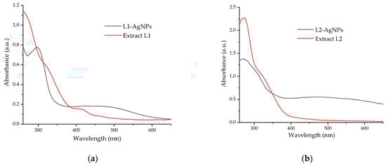 UV-Vis spectra of AgNP phytosynthesized, compared with the corresponding extracts: (a) L1, (b) L2, (c) L3, and (d) L4.