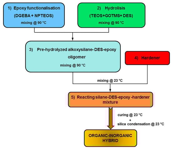 The procedure for the synthesis of the epoxy-based organic–inorganic hybrids consists of five steps, as schematized in Figure 1.