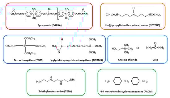 4) Mixing of alkoxysilane-DES-epoxy mixture with the hardener: A curing agent was, then, mixed to each silane-DES-epoxy mixture in order to induce the cross-linking reactions of the polymeric component of the mixture. To this aim, two different amine hardeners were selected, i.e., an aliphatic amine and a cycloaliphatic one. Triethylenetetramine (TETA), an aliphatic amine supplied by Elantas Italia S.r.l. (Collecchio, Italy) with the trade name IG 824-K24, and 4-4’ methylene bis-cyclohexanamine (PACM), a cycloaliphatic amine supplied by Aldrich, are both suitable curing agents for cold-curing of the epoxy resin. Each hardener was, then, added to the mixtures at ambient temperature, in order to avoid premature heat-curing, continuously mixing the liquid formulations for 30 min. The analyzed mixtures were labeled with a final “A” or “B” depending on the hardener used, TETA or PACM, respectively.