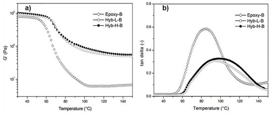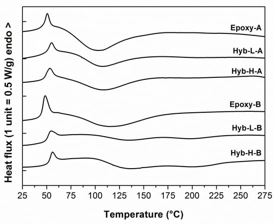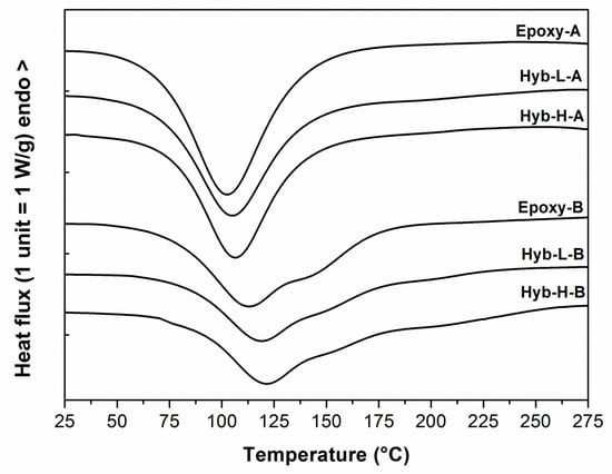 The dynamic DSC thermograms of the systems under analysis after a 7-day curing carried out at ambient temperature are reported in Figure 4. All the calorimetric curves display the typical behavior of cold-cured epoxy resins, featuring a first endothermic peak at the upper temperature side of the glass transition, manifested as a relief of the enthalpy acquired by the “physical aging” process during curing []. After the Tg interval, a broad exothermic peak at higher temperatures can be noticed. It is relative to the completion of the curing reactions, which are often not completed when the cure is performed at ambient temperature []. As observable in Figure 4, the glass transition temperatures measured for epoxy-based hybrid systems are higher than those measured on parent non-hybrid systems.