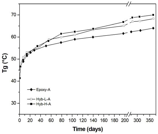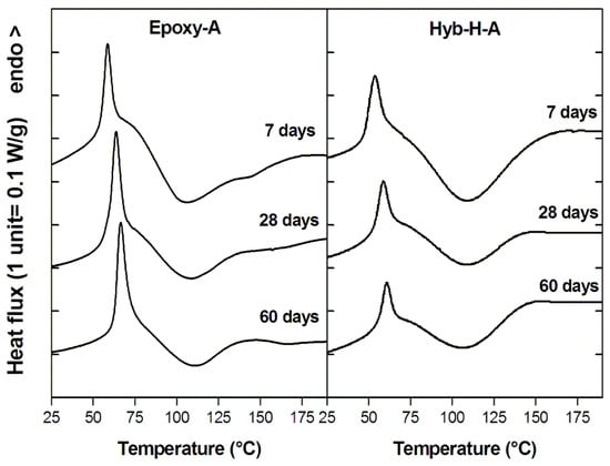 It should also be noted that, irrespective to DES content and curing agent typology, the endothermic peak associated to the physical aging measured for an hybrid system is smaller compared to the same peak observed for the control resin, demonstrating that the evolution of the short range molecular order within the epoxide network resulting from physical aging has been hindered by the presence of alkoxysilane species. This is confirmed also by monitoring the aging at room temperature for longer times, as reported, as an example, in Figure 5 for the Hyb-H-A system in comparison with Epoxy-A.