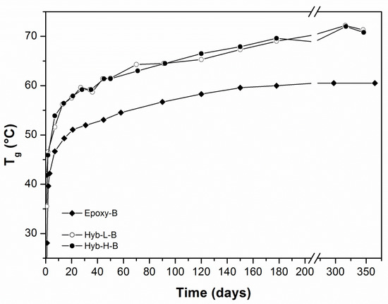 Passing to analyze the hybrid systems cured with PACM (Figure 7), both formulations are able to develop in shorter times Tg values much higher (even greater than 70 °C) than those measured for the relative non-hybrid epoxy system, irrespective to aging time and DES content. In this case, the process of cold-curing seems to be stopped after about 9 months, irrespective to the kind (non-hybrid or hybrid) nature of the system. As already mentioned in the Introduction section, the commercial cold-cured epoxy-based resins never achieve glass transition temperatures much higher than 60 °C, even after prolonged cold-curing times []. An increase in Tg of 10 °C represents an encouraging result proving the effectiveness of the presence of DES in a cold-curing epoxy resin.