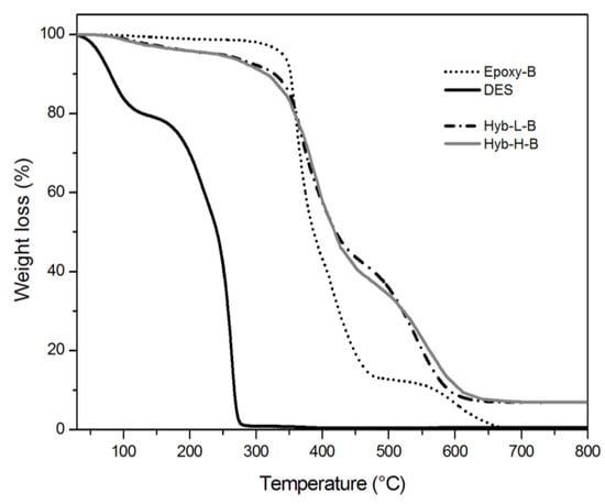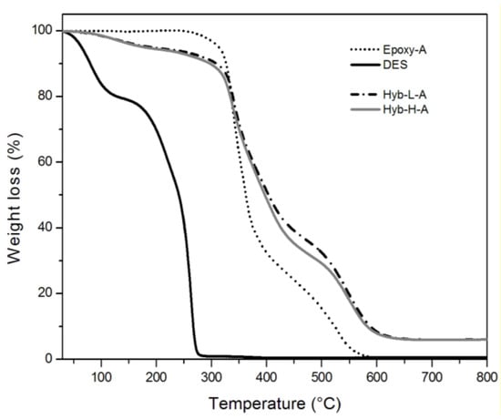 Referring to the hybrid systems, they undergo a first weight loss between 80 °C and 200 °C, irrespective to the DES content and the curing agent typology, differently from what is observed for both control systems, i.e., Epoxy-A and Epoxy-B. This loss is a measure of the amount of volatiles (water and mostly alkanols) that are given out through the condensation reactions within the siloxane domains. This phenomenon has been already reported in literature for other epoxy–silica hybrid systems obtained from the sol–gel process [,]. Furthermore, hybrid systems undergo a 10% weight loss at lower temperatures than those measured on the relative control systems; regardless to the kind of hardener, the difference between T0.1 values for the control and hybrid systems is about 20 °C for systems with the lowest content of DES and 30 °C for systems with the highest content of DES, respectively. This can be attributed to the thermal decomposition of ammonium cations associated with DES.
