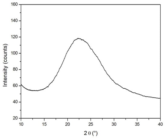 The nature of the particles formed through the hydrolysis and condensation reactions, concurrent with the cross-linking of the organic component of the mixture, was also investigated. To this aim, samples of O-I hybrid systems were burned out at 500 °C for 15 h and then analyzed by X-ray diffraction (XRD) analysis. As an example, the XRD pattern of Hyb-H-B sample is reported in Figure 10. In this latter, a wide peak centered at 2θ = 22.5° is clearly visible, corresponding to the peak representative of amorphous silica, as reported in the literature [].