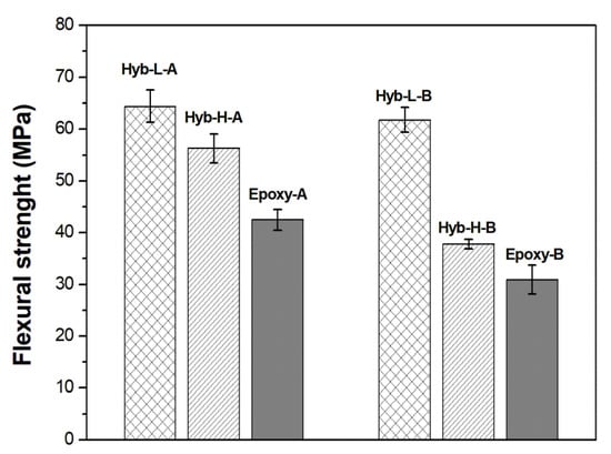 The comparison between the mechanical properties measured in flexural mode (i.e., modulus and strength) for the four hybrid systems and the respective non-hybrid resins, is shown in Figure 11 and Figure 12, respectively. The results of the flexural mechanical tests are summarized in Table 4 for all the analyzed systems.