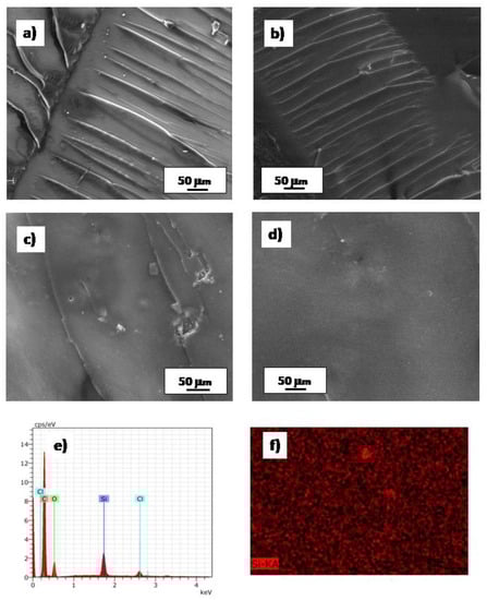 SEM images of: (a) Epoxy-A, (b) Epoxy-B, (c) Hyb-H-A and (d) Hyb-H-B; (e) EDS analysis of Hyb-H-B; (f) EDS map of the Silicon distribution in a Hyb-H-B sample.