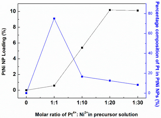 PtNi NPs loading and the percentage composition of Pt in PtNi NPs as a function of the molar ratio of Pt4+:Ni2+ in the precursor solution.