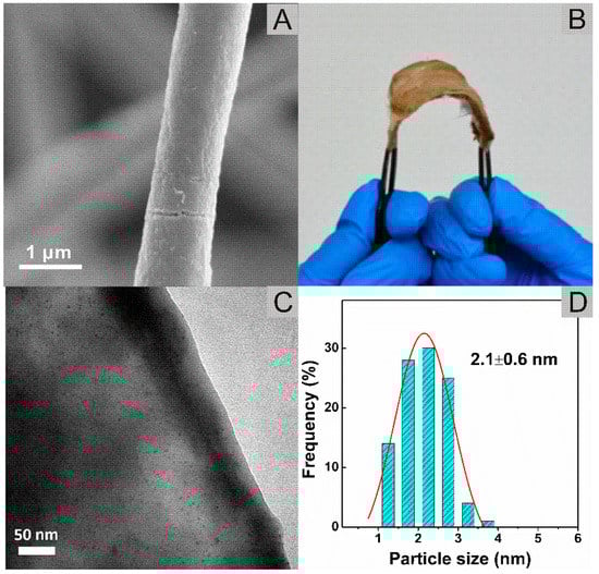 SEM images of PtNi/PMMA@PDA nanofilm (A); the digital photo of the PtNi/PMMA@PDA-1/10 nanofibrous membrane (B); TEM image of PtNi/PMMA@PDA-1/10 nanofibrous membrane (C); Corresponding size distribution of the supported PtNi nanoparticles (D).