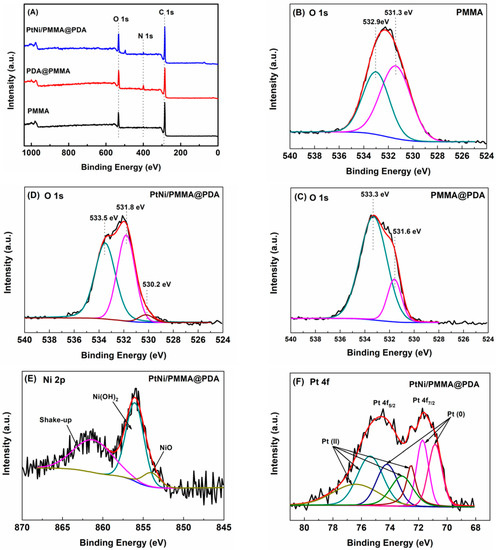 XPS spectrum: Wide survey spectra of the fibrous membranes from each process (A); O 1s of PMMA (B); PMMA@PDA fiber (C) and PtNi/PMMA@PDA (D); Ni 2p (E) and Pt 4f (F) of PtNi/PMMA@PDA fibrous membrane.