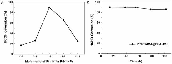 HCHO conversion over various PtNi/PMMA@PDA fibrous membranes with 0.02 dosage at 25 °C as a function of the molar ratio of Pt:Ni in PtNi NPs (A); HCHO conversion over PtNi/PMMA@PDA-1/10 as a function of time-on-stream (reactant gas: 10 ppm HCHO, O2 20 vol %, GHSV 24 000 h−1) (B).