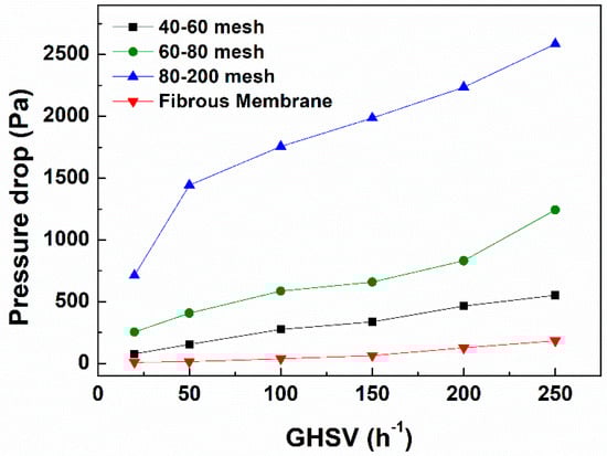The air resistance of the fibrous membrane and various commercial aluminum oxide pallets (Al2O3) with different meshes were also tested on the same fixed-bed reactor equipped with a pressure gauge (3051TG, Jiangsu Yiming meter Co., LTD., Yangzhou, China). The feeding gas only consisted of the air steam without any reactive component, i.e., HCHO gas. The pressure drop under different flow rates (20–250 ml min−1) was recorded.