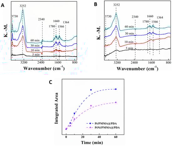 In situ diffuse reflectance infrared Fourier transform spectroscopy (DRIFTS) spectra of gas mixture (O2 + He + HCHO) adsorption at 25 ℃ of Pt/PMMA@PDA (A) and PtNi/PMMA@PDA-1/10 (B); Intensity of 1566 cm−1 peak vs. time for Pt/PMMA@PDA and PtNi/PMMA@PDA during gas mixture adsorption for 60 min (C).