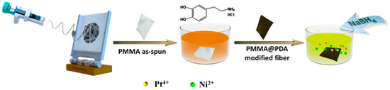 Preparation of platinum–nickel nanoparticles/polydopamine-coated polymethylmethacrylate electrospun-fibers (PtNi/PMMA@PDA) catalytic nanofibrous membrane.