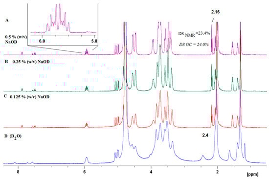 1H NMR of HA-UDA (Mw = 261,800 g/mol) acquired in D2O without (D), and (A–C) increasing the concentration of NaOD (up to 0.5 % (w/v)).