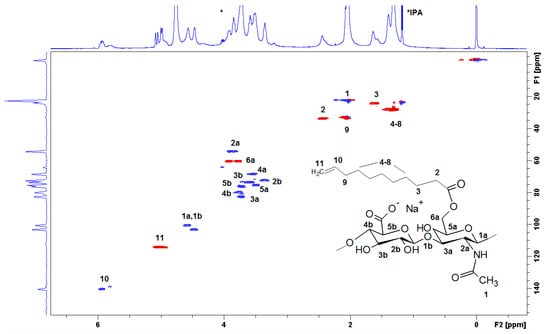 The full structural assignment of the chemical structure was obtained by HSQC (Figure 3). HA presents anomeric signals at 4.8 to 4.4 ppm (1a and 1b), and skeletal H signals (at 4.2 to 3.2 ppm). Finally, the methyl of N-acetyl group is located at 2.1 ppm (1), which is overlapped with the bridge methylene 9 in D2O. The DS was determined using the relative integral value of the methylene signal at 2.4 ppm (2, –CH2 in position α to the carbonyl), which is shifted to 2.2 ppm in NaOD. The β proton was located at 1.6 ppm (3) while the additional methylenes appeared at 1.39 (protons 4–8), and the terminal methylidene (11) appeared at 4.9 ppm, and the methine (10) was located at 5.9 ppm. The benzoylation of HA was also presented (signals at 7,6, 7.7, and 8.0 ppm, respectively).