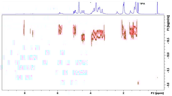 Diffusion-ordered spectroscopy (DOSY) spectrum of HA-UDA determined in D2O (HA-UDA, 15 kDa and DS = 35.4%), containing isopropanol as impurity.