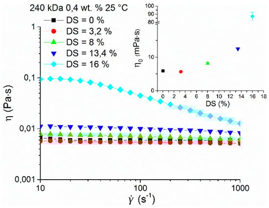 Dependence of viscosity on the shear rate of HA-UDA (240 kDa) with a concentration of 0.4 wt.% and various degree of substitution (DS) in physiological solution (0.9 wt.% of NaCl) at 25 °C. The inset shows the dependence of the determined zero shear viscosities on DS. The graph contains a break between 20 and 80 mPa∙s for better clarity.