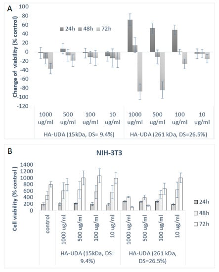 The cytotoxicity of HA-UDA materials was evaluated by direct contact using (NIH-3T3) cell fibroblasts. The standard cytotoxicity model 3T3 Swiss cell line was chosen as the control cell line because it is nontumorigenic and at the same time its cell cycle is fast [,]. As it is shown in Figure 6, HA-UDA positively affected the growth of NIH-3T3 cells after 24 h of incubation. The derivatives have not shown any acute cytotoxicity in the studied concentrations (10–1000 μg/mL). Furthermore, the derivatives slowed down the cell growth after 48 h of incubation time. After 72 h, the derivatives started to be metabolized by the cells and showed a slightly cytotoxic effect.
