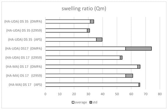 Furthermore, the free radical initiator system (APS/TEMED reduction–oxidation reaction) was also evaluated due to the observed degradation of active compounds under UV curing (Figure S8). The swelling ratio of HA-UDA showed that DS of 35% was the most efficient. In this case, a low concentration of derivative (1.5 wt.%) was used and a minimum swelling ratio was found (Qm = 35.6 ± 4.07). When the DS was lower (between 3.2% to 26.5%), chemical crosslinking was not observed (gels break in pieces). Physical hydrogels mediated by hydrophobic associations were formed at DS higher than 35%. Then, chemical crosslinking was not necessary. However, this fact has opened the possibility for new applications of the derivative.
