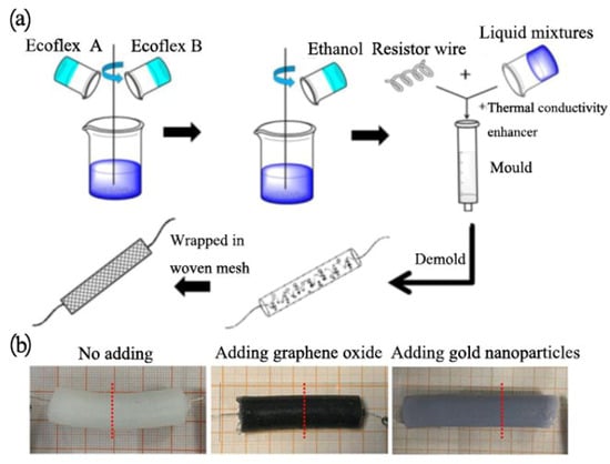 In this section, Ecoflex00-50 (Smooth-On Inc., Macungie, PA, USA) was used as the bulk material and ethanol (≥99.5%) was selected as the active phase change material. Both GO and Au nanoparticles were applied as the thermally conductive enhancement phase, respectively, because of their good electrothermal conversion performances. As shown in Figure 1a, for a control, ethanol was first added to the Ecoflex A component, then added to the B component to get the homogeneous solution (20 vol% of ethanol with respect to the 80 vol% Ecoflex mixture). The composite elastomer containing graphene oxide was also prepared via a similar experimental process, except for the adding of graphene oxide in the prepolymer solution. Au nanoparticle composite elastomers were prepared slightly different (firstly, aqueous solution of gold nanoparticles was thoroughly dried in a beaker, then dissolved in ethanol, placed in ultrasonic dispersion for 30 s, added to component A for about 2 min, and then mixed with component B for about 2 min). After the resistor wire was introduced, each of the mixture was thermally cured at room temperature for 5 h in a syringe mold to get the control ethanol phase change material. The specific formulation is shown in Table 1, where the concentration of Au nanoparticles is 1 mol/L. The material is poured into commercially available 5 mL syringes. After being fully cured, the composite elastomers were removed, and the properties of composites were tested (Figure 1b). Among those, a Ni-Cr resistive wire (d = 0.25 mm) was added to the composite cast mold for electrically driven heating of the artificial muscle. To facilitate the expansion of actuator material, the resistance wire was manually wrapped around plastic rod(d = 6 mm). Then we prepared composite elastomer with different heat conducting media, as shown in Table 2.