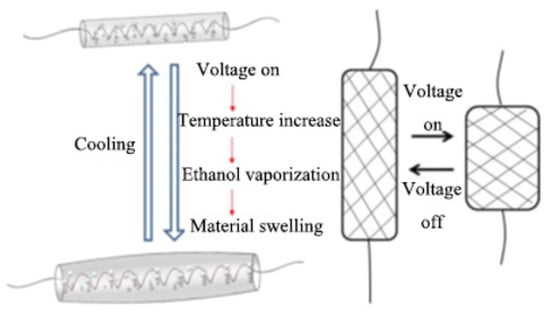As one of the miracles of nature, muscle, the source of human strength, has intensively inspired researchers to conduct a lot of research on soft deformation materials that develop and simulate the function of artificial muscle tissue [,]. Commonly used artificial muscles are mechanically driven, including pneumatic and hydraulic [,,,]. Various materials have been adopted to prepare the artificial muscles, which involves electroactive polymers [,,,,,], shape memory materials [,,,], hydrogels [,,,], and polymers driven by photothermal or humidity [,,,,,]. There are also biogenic actuators that rely on animal muscle cells [,]. As a drive for soft robots, fluid actuators require large external devices (e.g., air pumps, hydraulic pumps, etc.) to provide power, largely limiting the miniaturization of soft robotics applications. In contrast, electroactive polymers require high voltage (greater than a few kilovolts). Shape-memory alloys, shape-memory polymers and photo-thermal temperature-driven polymers require complex external stimuli (laser, humidity, and temperature control), and these actuators are difficult to adapt to more complex applications. Based on these, we believe that the ideal actuators need to have more direct and convenient actuation (current driven), safe actuation conditions (non-toxic and harmless to the operator), and fast and large strain capacity.