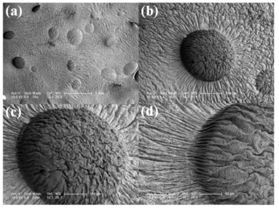 We observed the microscopic morphology and the structure of the prepared ethanol phase change material by scanning electron microscopy. The experimental results are shown in Figure 3. It can be observed that the ethanol phase change actuator has a well-defined crater structure inside, which is produced by the vacuole formed by ethanol in silicone elastomer. The distribution of crater in ethanol phase change actuator is relatively uniform, indicating that the even distribution of ethanol in the ethanol phase change actuator. This uniform distribution is the basis for stable growth of its output force. It can be found that the interior of ethanol phase change actuator is relatively flat except for the pits. The shape of pits is hemispherical, which proves that ethanol exists in the form of spherical vacuoles in the ethanol phase change artificial muscle. The overall surface is relatively smooth with small and uniform wrinkles. We analyzed that the wrinkling was caused by the shrinkage of ethanol and silicone elastomer when they were frozen and cracked. The wrinkles inside pits are more intensive than those on the outer surface due to their spherical shape. The shrinkage of the inner surface caused by the rapid freezing and cracking of pits under liquid nitrogen is more pronounced than the shrinkage of the outer surface.