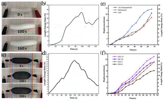 It can be seen from Figure 4e that the length change of three ethanol phase change actuators is slow and then fast throughout the driving process, and the difference in deformation rate of three ethanol phase change actuators appears at 27 s. The deformation rate of the graphene oxide/ethanol phase change actuator is the largest, while the shrinkage rate of blank control and Au nanoparticle/ethanol phase change actuator is less, and the difference between them is not significant. As the energization time increases, the deformation rate gradually became larger. From the slope, it can be concluded that the addition of graphene oxide and Au nanoparticles increases the deformation rate and actuation efficiency, and the strengthen performances of graphene oxide is better than that of Au nanoparticles. It can be seen in Figure 4f, that the deformation of the ethanol phase change artificial muscle, with different graphene oxide contents, all perform axial expansion and radial contraction throughout the driving process. The deformation can be observed with the naked eye at 40 s. The deformation rate of GO-15 graphene oxide/ethanol phase change artificial muscle actuator is the largest, which can contract to half of the original length at 80 s. The deformation of whole process is slow in the initial stage and then fast. The deformation rate of ethanol phase change actuator increases after 18 s, and the degree of deformation also starts to become larger. With the increase of graphene oxide content, we can see that the deformation rate gradually increases, i.e., the slope of each line segment increases sequentially, and the driving rate of GO-15 is the fastest at 0.19 mm/s, which is 61% higher than GO-0. This indicates that the addition amount of graphene oxide affects the deformation of the graphene oxide/ethanol phase change artificial muscle actuator, causing the driving characteristics of the actuator to change. The driving rate and deformation degree of the graphene oxide/ethanol phase change artificial muscle actuator are enhanced with the increase of the graphene oxide content. The deformation analysis of the graphene oxide/ethanol phase change artificial muscle actuator verifies that the addition of graphene oxide can effectively increase its driving rate and enhance deformation capability.