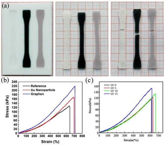 Mechanical properties of different types of ethanol phase change materials. (a) Tensile samples (without additions, with GO and Au nanoparticles), (b) Stress-strain curves of three samples. (c) Stress-strain curves of samples with different graphene oxide contents.