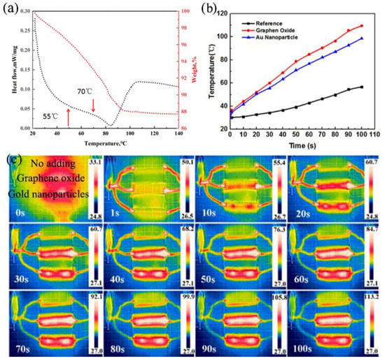 Thermal imaging test analyses were performed for blank sample, graphene oxide/ethanol phase change actuator and Au nanoparticle/ethanol phase change actuator, and the results were shown in Figure 6c. It can be seen that the heating rates of graphene oxide/ethanol phase change actuator and Au nanoparticle/ethanol phase change actuator are significantly faster than that of no adding sample. This proves that the addition of graphene oxide and Au nanoparticles can effectively accelerate the heating rates of the materials. The heating rates of the composites with graphene oxide and Au nanoparticles were the same until 52 °C. As time increases, the heating rate of composites with graphene oxide was about 10 °C higher than that with Au nanoparticles, proving that the thermal conductivity of graphene oxide was better than that of Au nanoparticles, which accelerated the deformation rate. As exhibited in Figure 6b, the heating process of three actuators is roughly linear, and the heating rates of ethanol phase change actuator, Au nanoparticle/ethanol phase change actuator and graphene oxide/ethanol phase change actuator can be calculated as 0.57 °C/s, 0.99 °C/s and 1.1 °C/s, respectively, within 100 s. The heating rates of the composites with additions are higher than that of the reference sample, and the addition of graphene oxide enhances the thermal conductivity more significantly, which is better than that of Au nanoparticles added actuator.